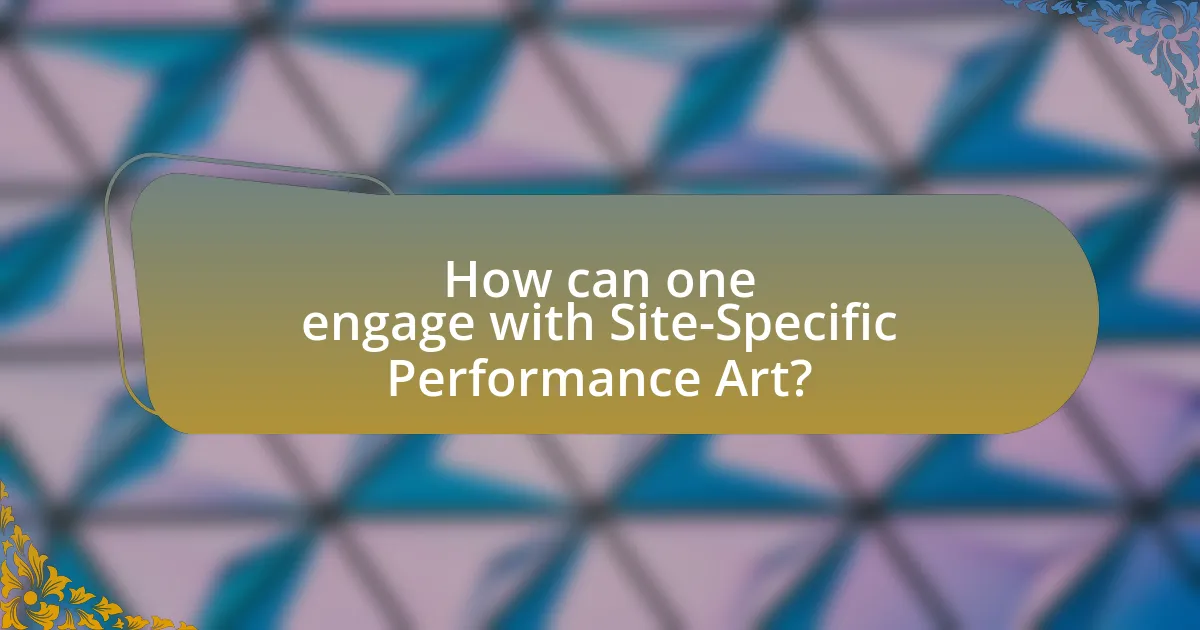 One can engage with Site-Specific Performance Art by actively participating in or observing performances that are tailored to a specific location. This form of art emphasizes the relationship between the performance and its environment, allowing audiences to experience the work in a context that enhances its meaning. For instance, performances may utilize the unique characteristics of a site, such as its history, architecture, or social dynamics, to create a deeper connection with the audience. Engaging with such art often involves attending events, interacting with performers, and reflecting on the experience in relation to the site itself, which can lead to a more profound understanding of both the art and the location.